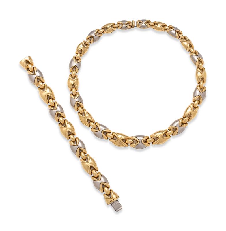 Consisting of a necklace with alternating yellow and bicolor gold links, together with a matching bracelet.