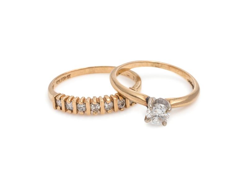 Consisting of a ring containing one round brilliant cut diamond weighing approximately 0.30 carat, together with a band containing seven round brilliant cut diamonds weighing approximately 0.20 carat total. Mounted in yellow gold.