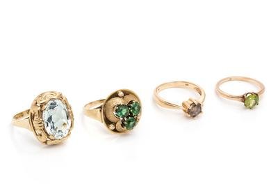 Consisting of a ring containing three green tourmaline, a ring containing one oval mixed cut aquamarine, a ring containing one round brilliant cut brown diamond (origin of color not tested) weighing approximately 0.80 carat, together with a ring containing one round mixed cut peridot.