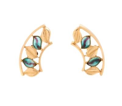 Consisting of curved leaf motif earclips with green and brown enamel detail, posts with clip backs.