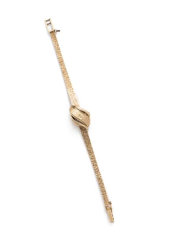 14.00 x 17.00 mm case dimensions, matte silver dial signed TISSOT, baton numerals, gold diamonds hands, snap on case back, manual wind movement, textured bracelet with fold over clasp and safety chain.