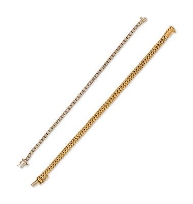 Consisting of a 14 karat gold bracelet containing 50 round brilliant cut diamonds weighing approximately 5.00 carats total, together with an 18 karat gold woven link bracelet.