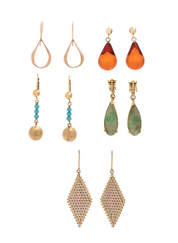 Consisting of a pair of Italian lozenge shape brick link tricolor gold drop earrings, a pair of open tear drop shape earrings, a pair of earrings with two tear drop shape amber drops, a pair of earrings with gold Asian characters suspending two pear shape nephrite, together with a pair of earrings with textured gold sphere drops and six round turquoise beads.