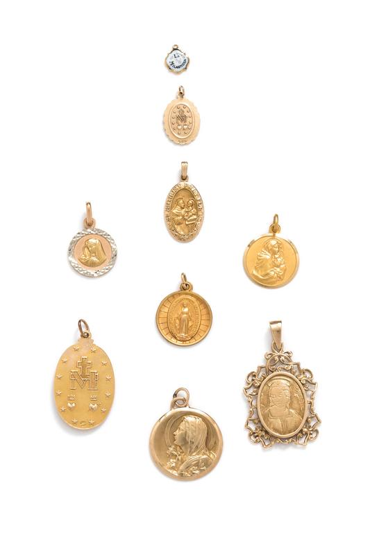 Consisting of an 18 karat Italian pendant depicting Mary with an openwork surround, an 18 karat Italian round charm depicting Mary and baby Jesus, an 18 karat bicolor gold Italian round pendant depicting Mary, a 14 karat oval shape Mary pendant, a 14 karat round Mary pendant, two 14 karat oval shape Mary pendants, a yellow gold round pendant by Georges Contaux depicting Mary, a painted enamel La Milagrosa pendant, together with a painted enamel Nasa de Conceicao pendant.