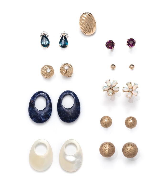Consisting of two pairs of brushed gold sphere stud earrings, a pair of high polish gold sphere stud earrings, a pair of textured gold stud earrings containing two round brilliant cut diamonds, a pair of flower motif stud earrings containing 10 oval shape opals and two round brilliant cut diamonds, a pair of stud earrings containing two round mixed cut amethyst, a pair of stud earrings containing two pear shape mixed cut blue topaz and 10 round brilliant cut diamonds, together with a pair of ribbed stud earrings with lapis lazuli, onyx and mother-of-pearl attachments.