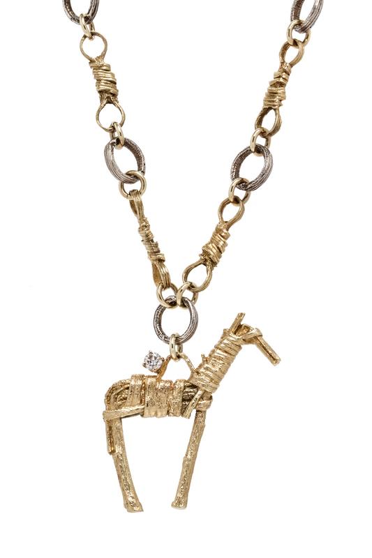 Consisting of a chain with alternating silver and yellow gold links suspending a horse pendant containing one round brilliant cut diamond weighing approximately 0.25 carat.