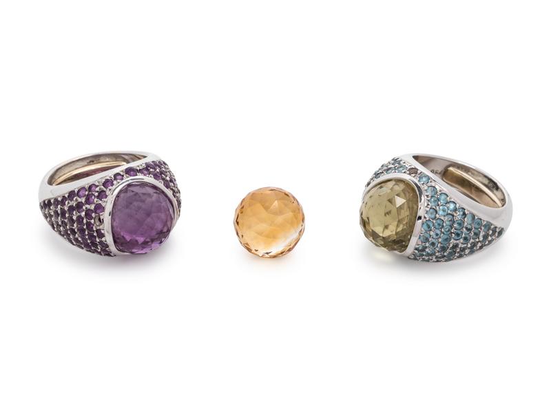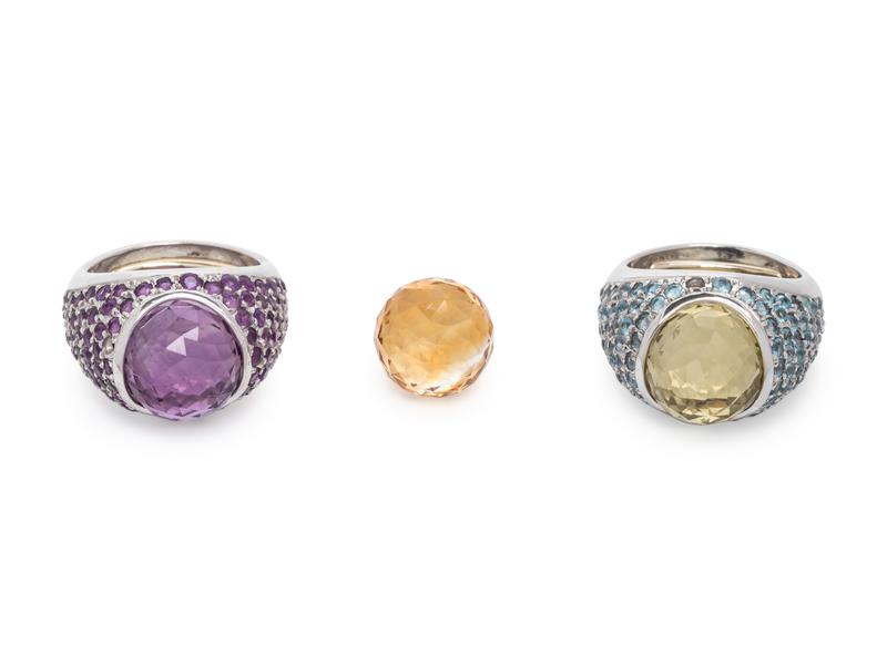 Consisting of a ring containing numerous round mixed cut blue topaz and a ring containing numerous round mixed cut amethyst, together with three interchangeable rose cut gemstone spheres.