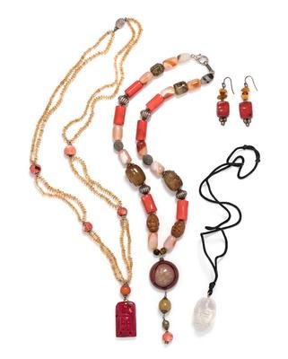 Consisting of a necklace containing round textured silver beads, barrel shape agate beads, carved wood, coral, and hardstone beads, a pair of coral and amber earrings, a silver pendant containing a carved coral depicting a Buddha suspended from a bead necklace with citrine rondelles, carved coral and silver spacer beads, together with a carved quartz pendant depicting the head of a man.
