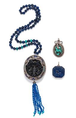 Consisting of a silver locket surmounted with carved hardstone depicting three frogs with blue and purple enamel detail, suspended from a lapis lazuli and turquoise bead necklace, with lapis lazuli and turquoise bead fringe, a snake pendant containing one oval shape cabochon cut turquoise, together with a pendant containing one hexagon shape carved lapis lazuli plaque.