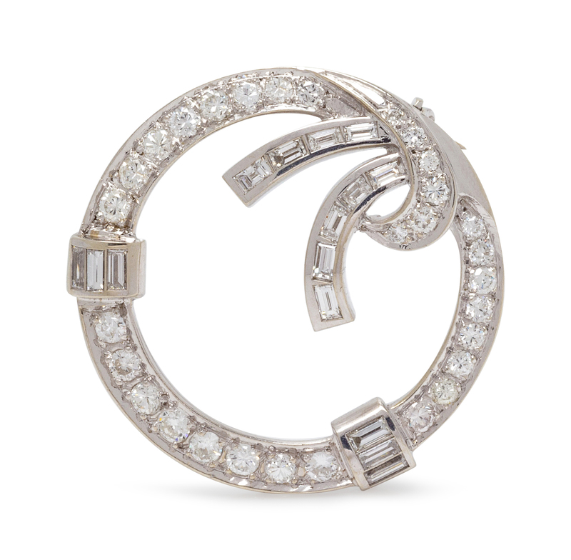 Containing 15 baguette cut diamonds weighing approximately 0.75 carat total and 30 round brilliant cut diamonds weighing approximately 1.35 carats total. Mounted in white gold.