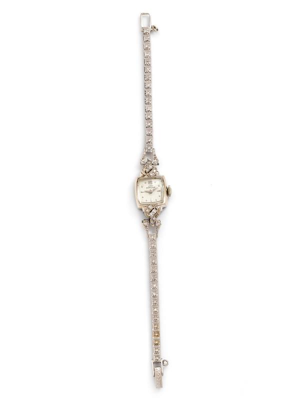 The lugs and bracelet containing numerous single cut diamonds, 14.00 x 15.00 mm case dimensions, white dial signed LADY HAMILTON, applied silvered dot and index numerals, silvered lancette hands, snap on case back, Cal. 737 manual wind 22 jewel adjusted movement signed HAMILTON, attached link bracelet, fold over clasp.