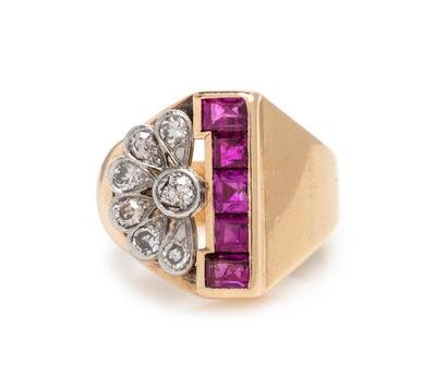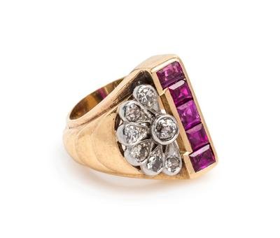 Containing five rectangular step cut rubies, one old European cut diamond and six single cut diamonds. Mounted in yellow gold and platinum.