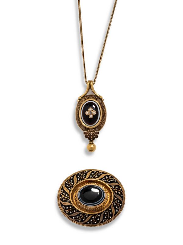 Consisting of a brooch containing one oval shape cabochon cut banded agate measuring approximately 16.80 x 13.30 mm, set in yellow gold with lily of the valley enamel decoration and a glass compartment on reverse, together with a pendant containing one oval cabochon cut banded agate measuring approximately 16.00 x 12.50 mm surmounted with a seed pearl floral plaque, suspended from a foxtail link chain.