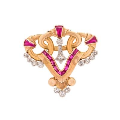 YELLOW GOLD, DIAMOND AND SYNTHETIC RUBY BROOCH