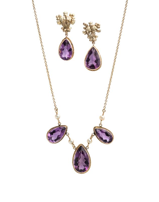Consisting of a necklace containing three pear shape mixed cut amethyst and four cultured pearl beads, together with a pair of earclips containing two pear shape mixed cut amethyst. Mounted in yellow gold.