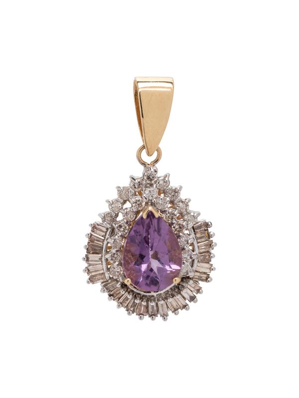 Containing one pear shape mixed cut amethyst measuring approximately 12.80 x 9.90 x 7.75 mm, 23 tapered baguette cut diamonds weighing approximately 0.70 carat total and 22 round brilliant cut diamonds weighing approximately 0.45 carat total. Mounted in bicolor gold.