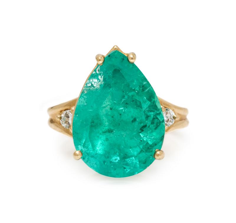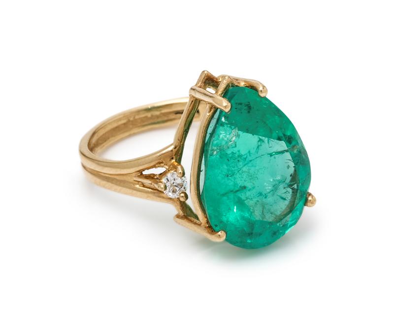 Containing one pear shape mixed cut emerald measuring approximately 16.90 x 12.35 x 9.05 mm and two round brilliant cut diamonds weighing approximately 0.10 carat total. Mounted in yellow gold.