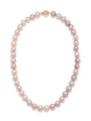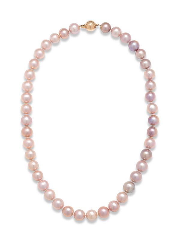 Containing 42 pink pearls measuring approximately 10.00 mm in diameter, strung knotted with a yellow gold clasp.