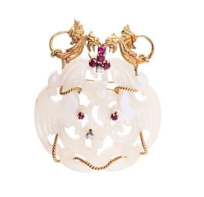 Containing one pierced and carved jade plaque, six round mixed cut rubies measuring approximately 2.60-3.60 mm and two round brilliant cut diamonds weighing approximately 0.18 carat total. Mounted in yellow gold.