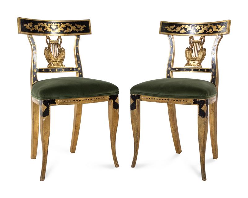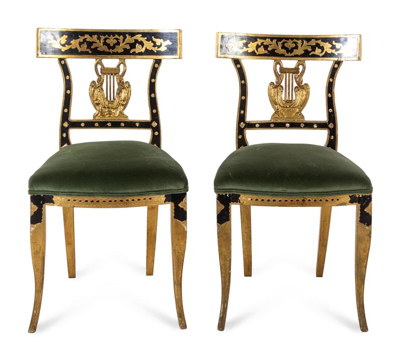 A Pair of Italian Parcel Ebonized and Giltwood Side Chairs