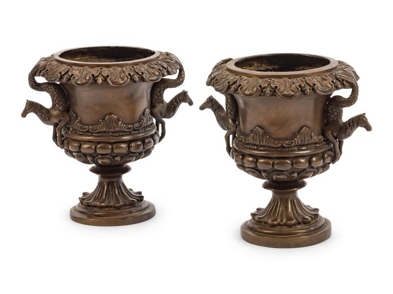 A Pair of Pompeian Style Patinated Bronze Urns