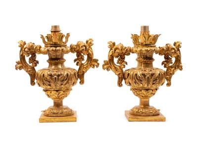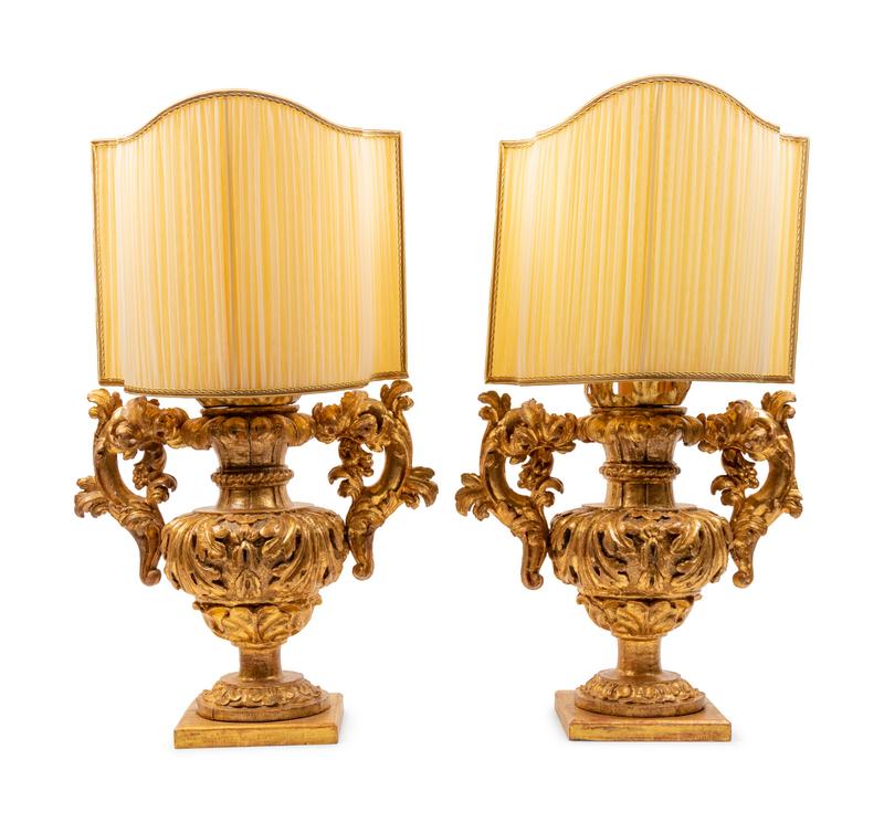 A Pair of Italian Giltwood Finials Mounted as Lamps with Silk Shades