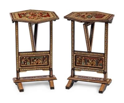 A Pair of Egyptian Revival Polychrome-Decorated and Inlaid Tilt-Top Tables