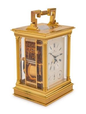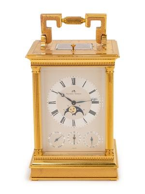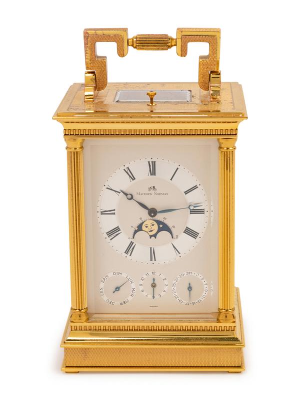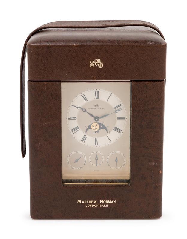 the dial with Roman numeral hours, a moon phase and three additional dials, together with a leather traveling case and key.