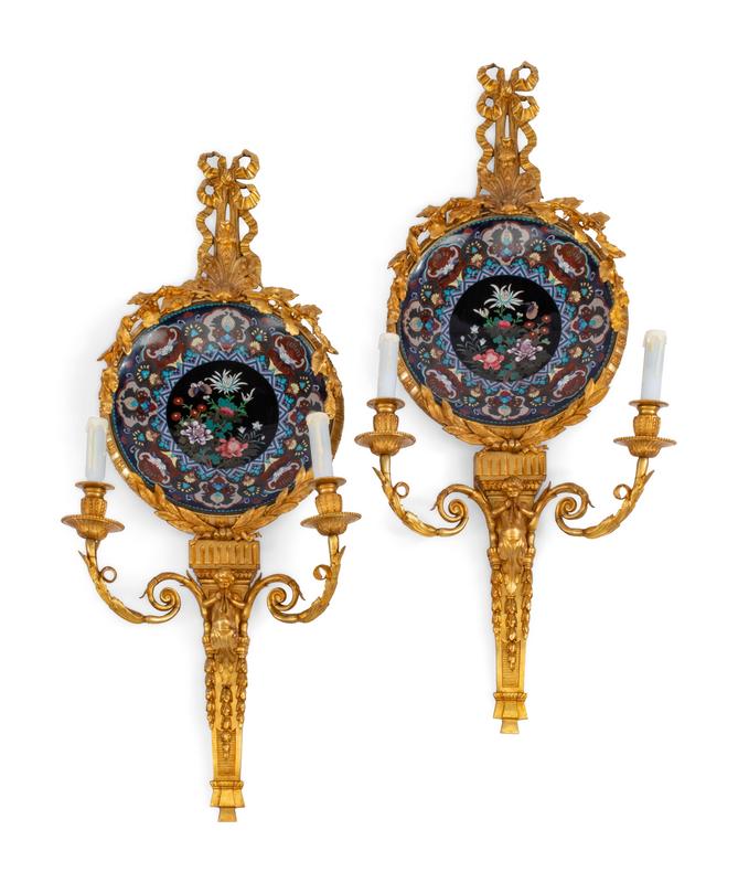 A Pair of Louis XV Style Cloisonné Enameled Gilt Bronze Sconces