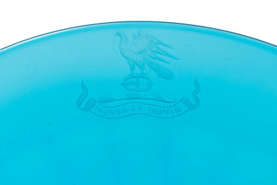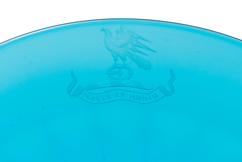each etched with a banner reading Muneo Et Munio, the bottle with silver mounts for London, dated 1829; comprising 8 wine glasses; 8 champagne glasses; 12 dinner plates; 10 dessert plates; 10 bowls; 2 footed bowls; 1 covered jar and 1 bottle; 52 items total.