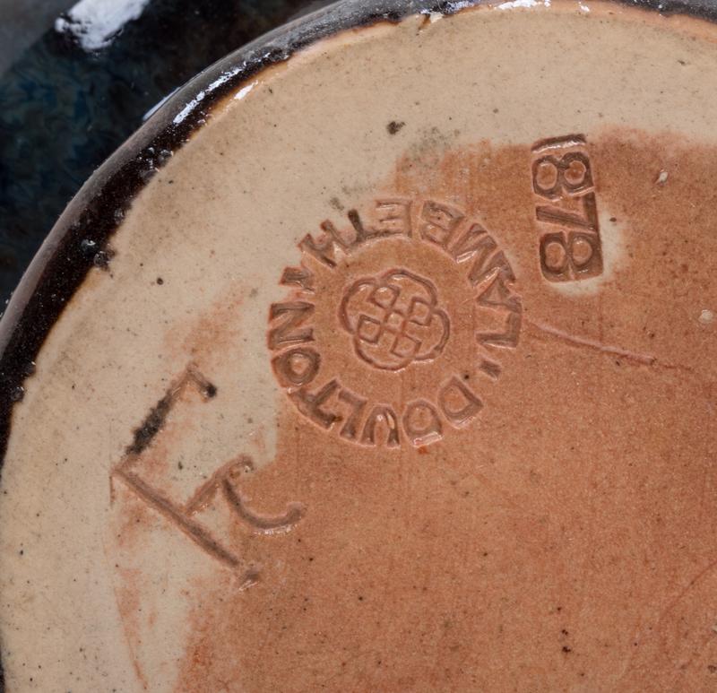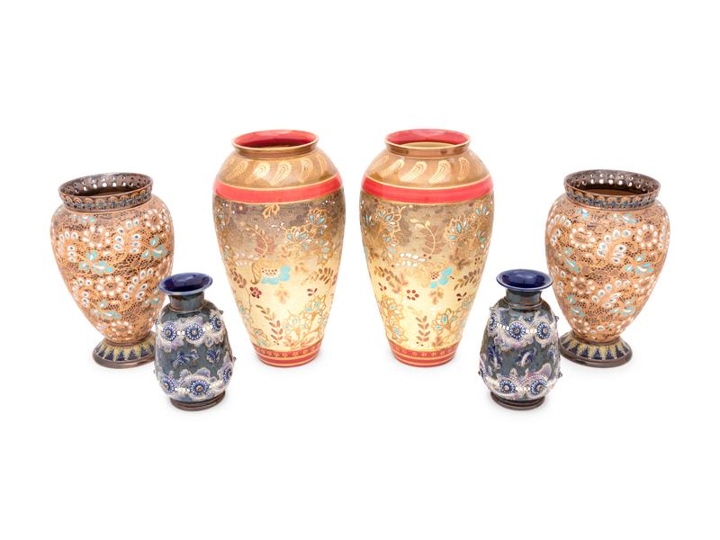 the tallest and middle pair with impressed Doulton Lambeth England (used after 1891) and Doulton & Slater's Patent marks, the small bud vases with impressed Doulton Lambeth mark and dated 1878 to the underside, each with various other impressed and incised marks to the undersides.
