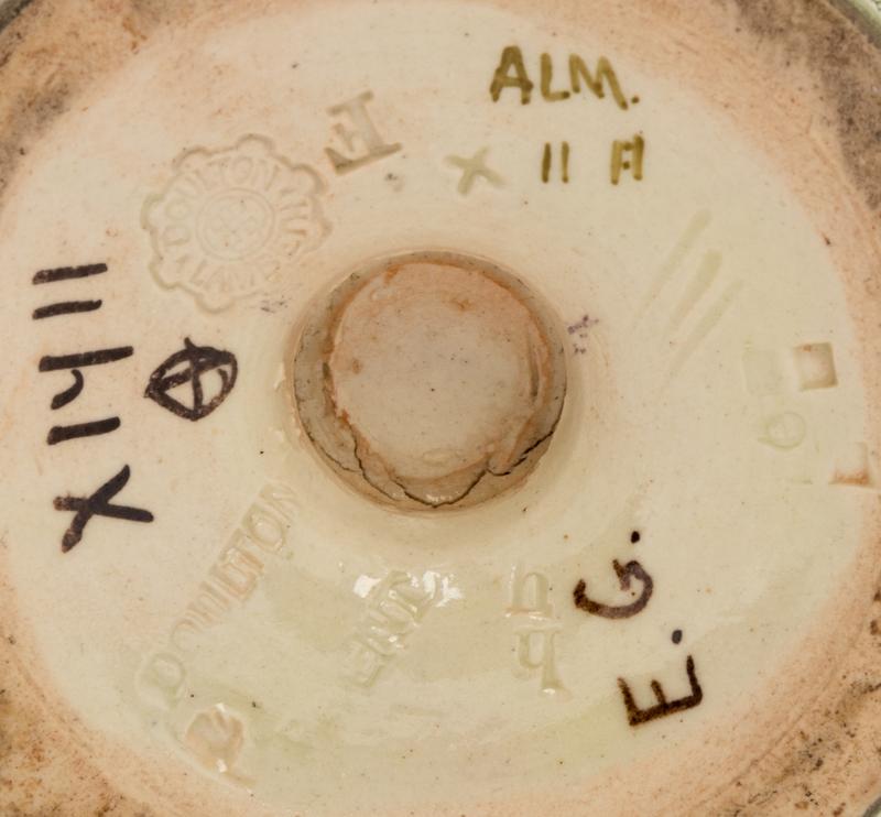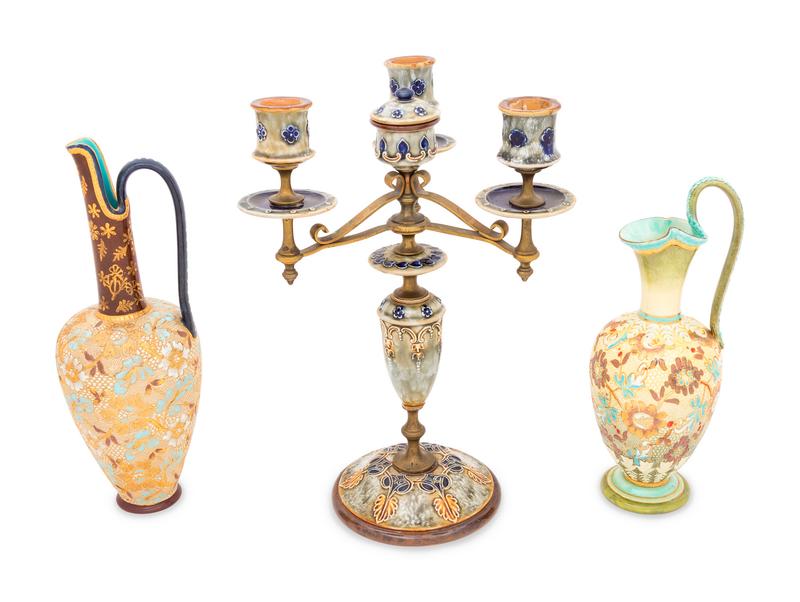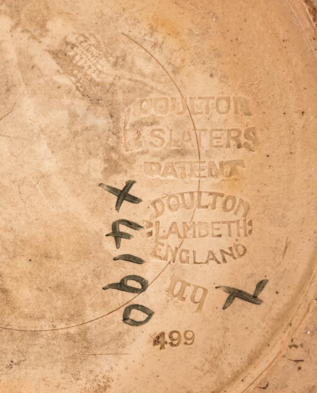 the four-light candelabra with impressed Royal Doulton England (used 1902-1922) mark; three examples with impressed Doulton Lambeth England (used 1891-1956) and Doulton & Slater's Patent (used 1886-1914) marks; one example with impressed Doulton Lambeth (used before 1891) and Doulton & Slater's Patent (used 1886-1914) marks and one example with impressed Lambeth Doulton Faïence (used between 1872-1914) mark.