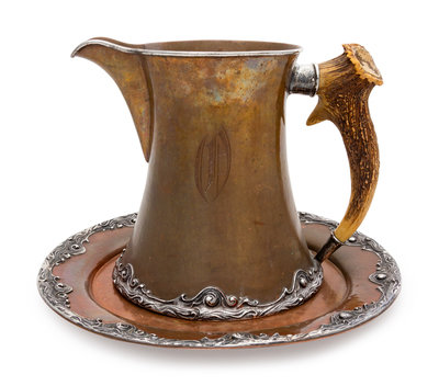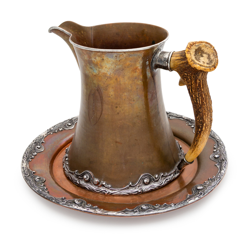 each with a martelé finish, the pitcher with an antler handle, each stamped SHREVE & CO/STERLING AND OTHER METALS.