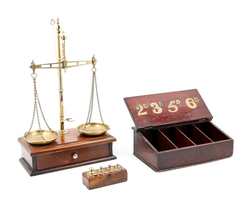 A Brass Balance and a Parcel Gilt Decorated Retail Cigar Box