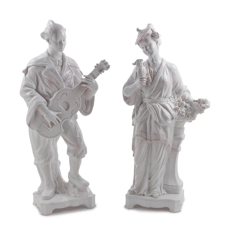 A Pair of Large Mottahedeh White Glazed Terra Cotta Chinoiserie Figures