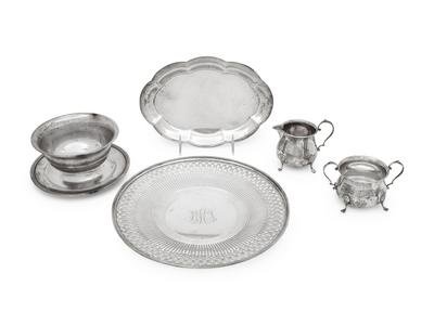 comprising a reticulated cake tray, a scalloped plate, a cream and sugar set, and a bowl with attached underplate.