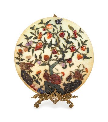 A Chinese Amethyst, Rose Quartz and Lapis Lazuli Inlaid Circular Plaque
