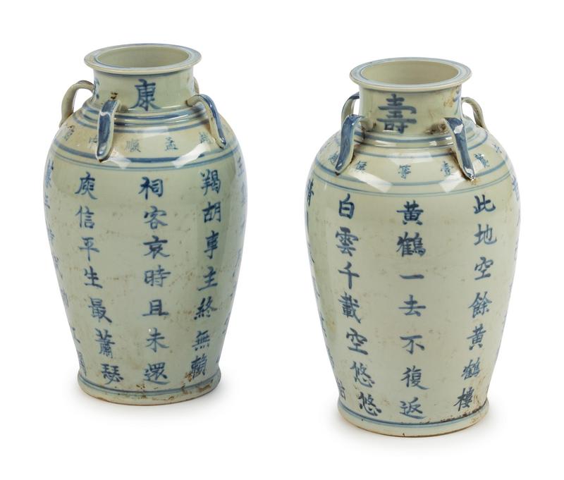 A Pair of Chinese Export Calligraphy-Decorated Porcelain Vases