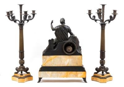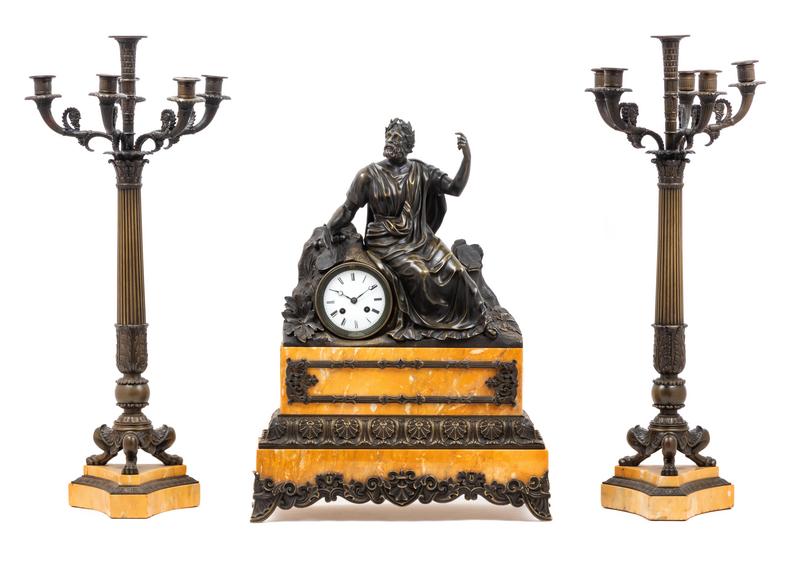 A Neoclassical Style Gilt and Patinated Bronze and Sienna Marble Clock Garniture