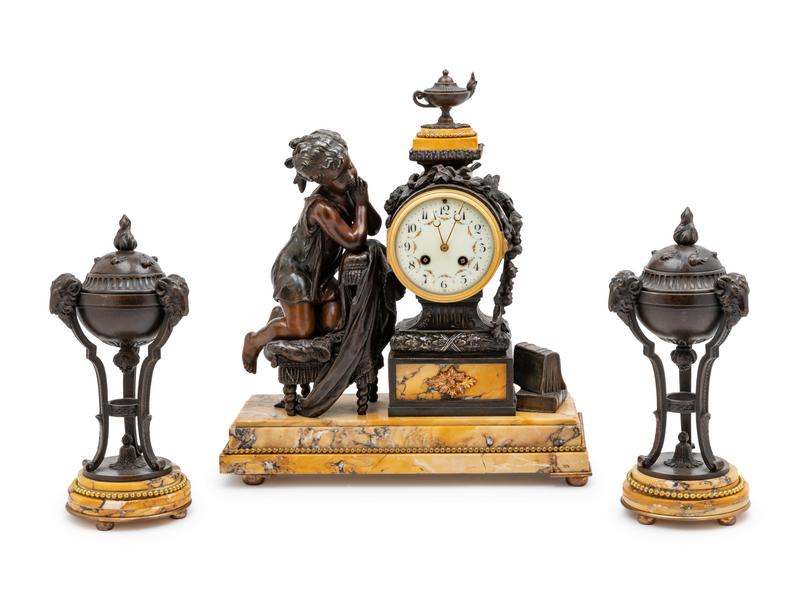 A French Patinated Metal and Marble Three-Piece Clock Garniture