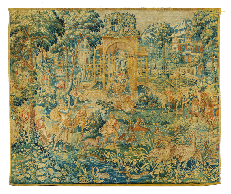depicting Henry II and other hunters among a leopard and other beasts, with a villa visible in the background.