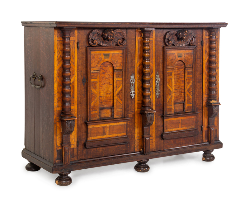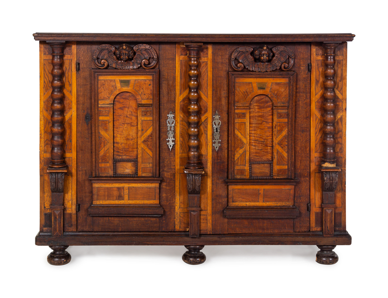A German Carved Walnut and Parquetry Cabinet