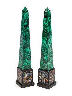 A Pair of Malachite Obelisks with Specimen Marble Bases