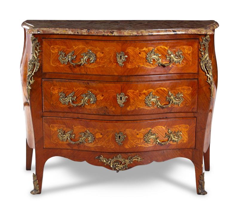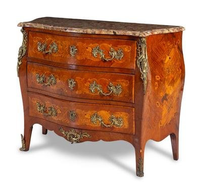 A Louis XV Style Gilt Bronze Mounted Marquetry Marble-Top Commode
