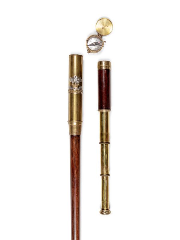 A British Silvered Metal Mounted Brass 'Royal Hussars' Explorer's Walking Stick