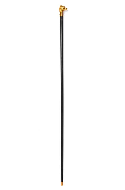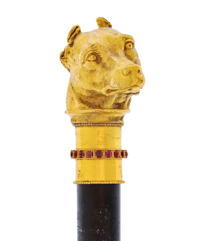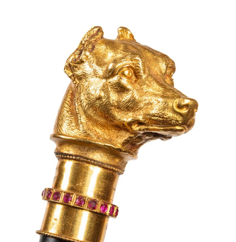 the handle in the form of a hound's head with a ruby banded collar above the ebony handle ending in a horn ferrule.