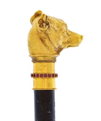 A Continental High-Karat Gold and Ruby-Inset Zoomorphic Walking Stick