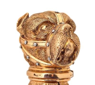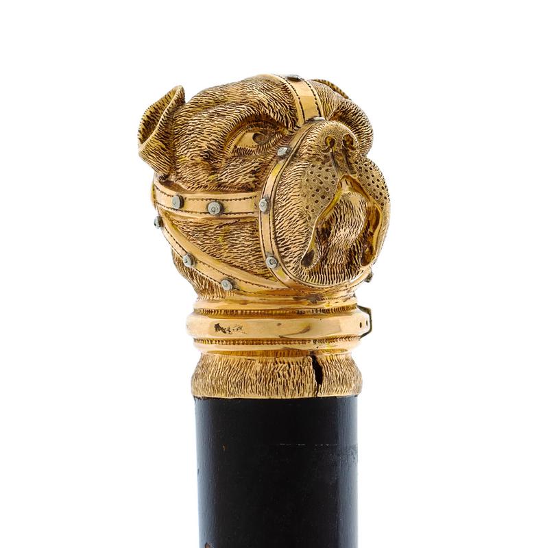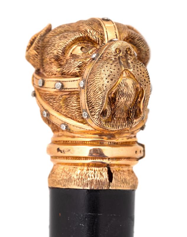 the handle in the form of a muzzled bulldog's head above the ebony shaft ending in a horn ferrule.