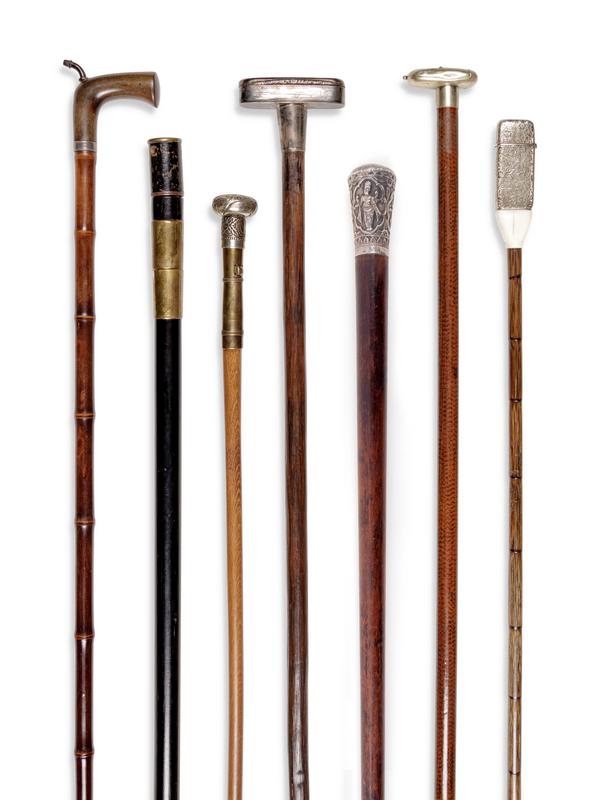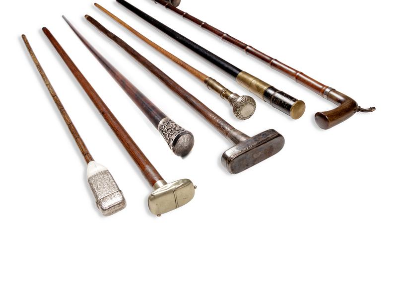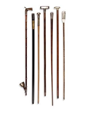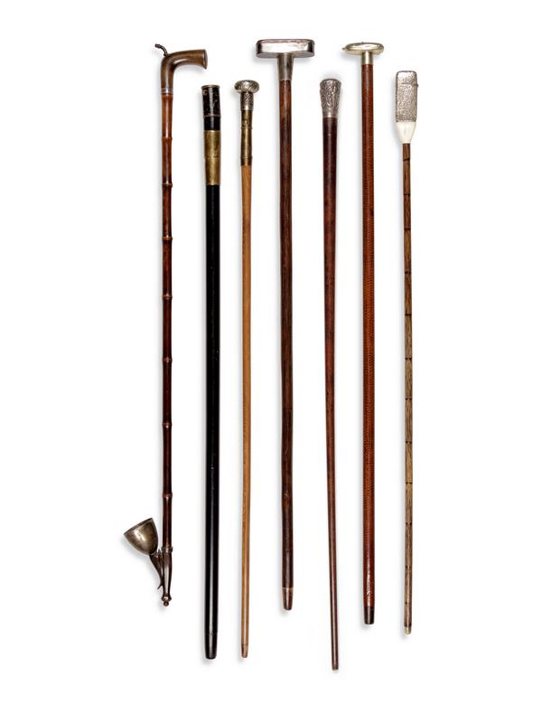 Seven Silvered Metal and Brass Mounted Smoker's System Walking Sticks