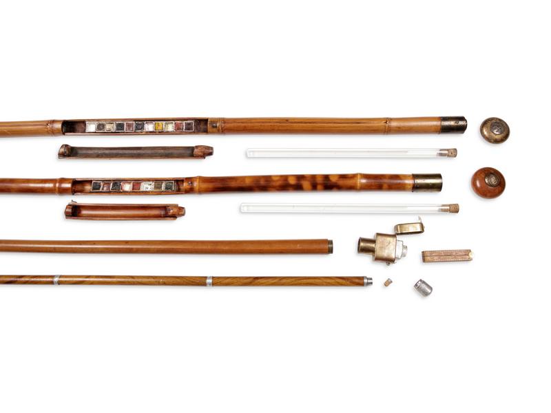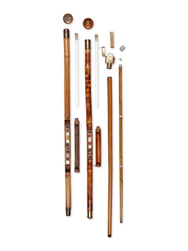comprising two bamboo examples concealing a water tube; a palette and brushes; an example concealing an inkwell with a measuring stick and an example detaching into three sections.